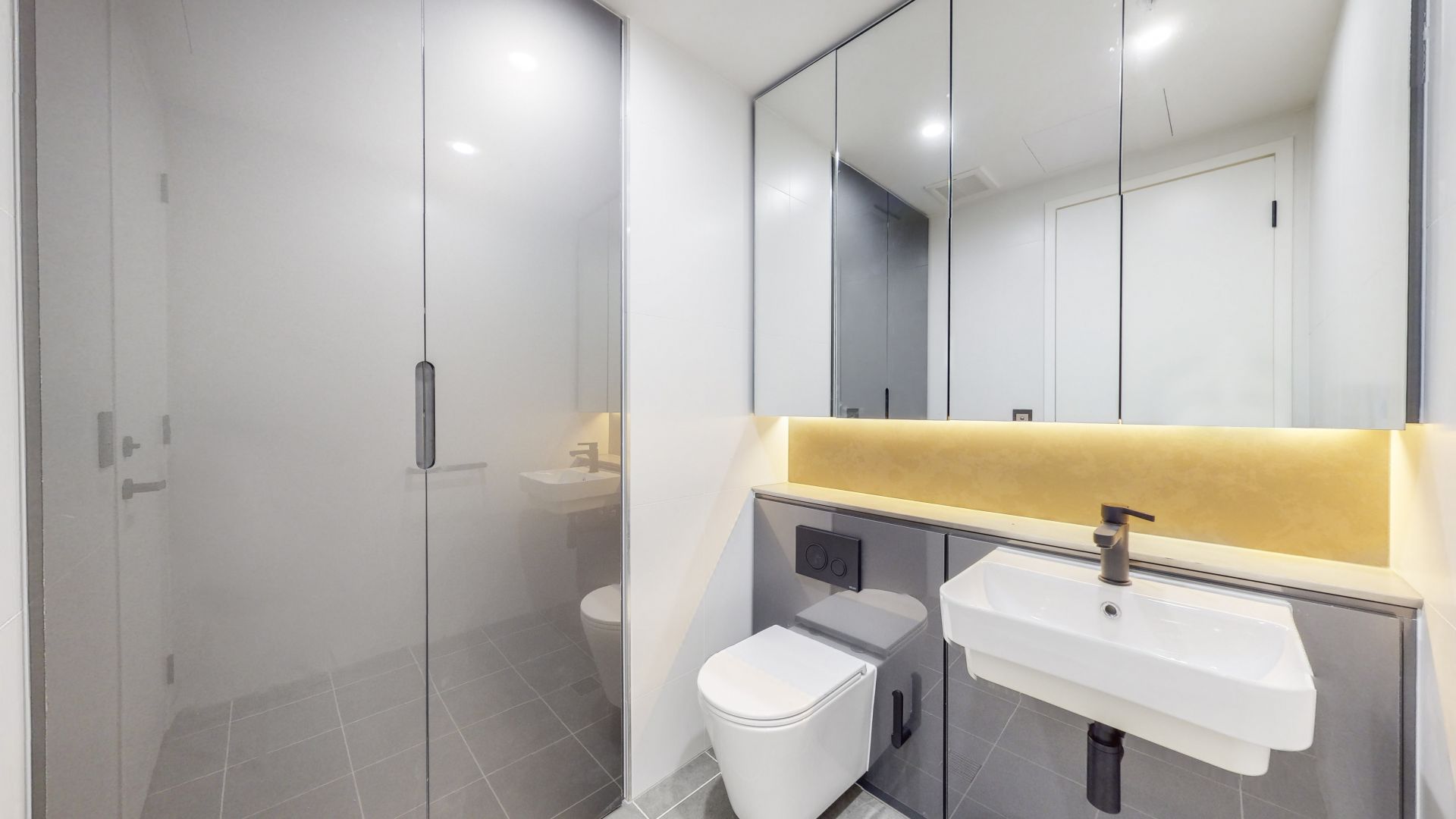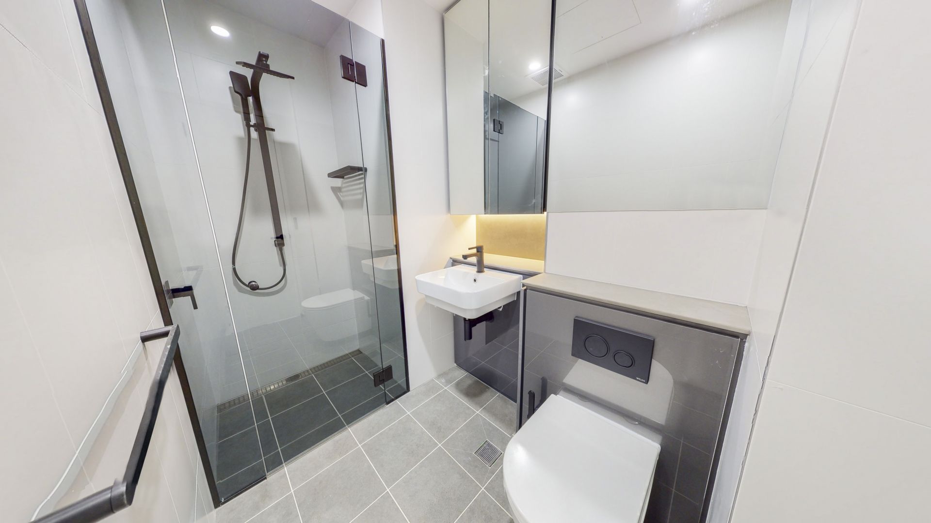 - Sleek deluxe bathroom with frameless glass shower