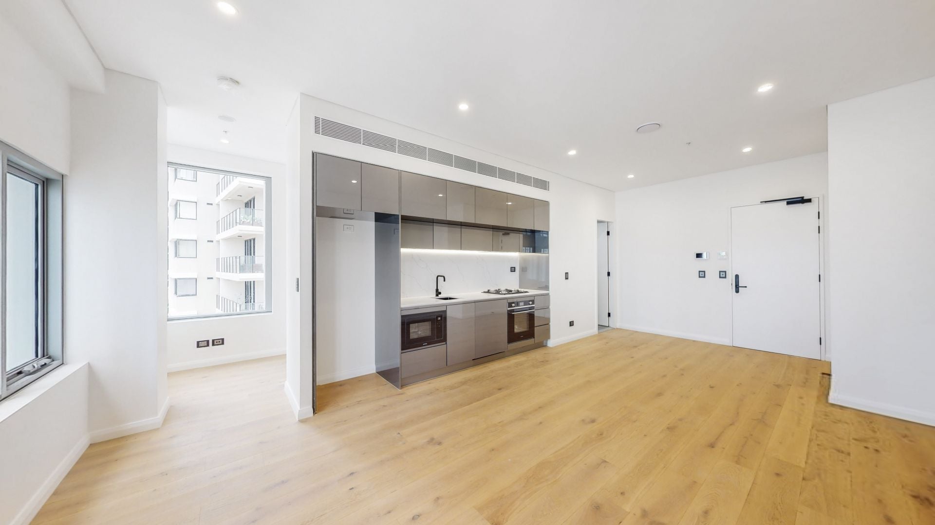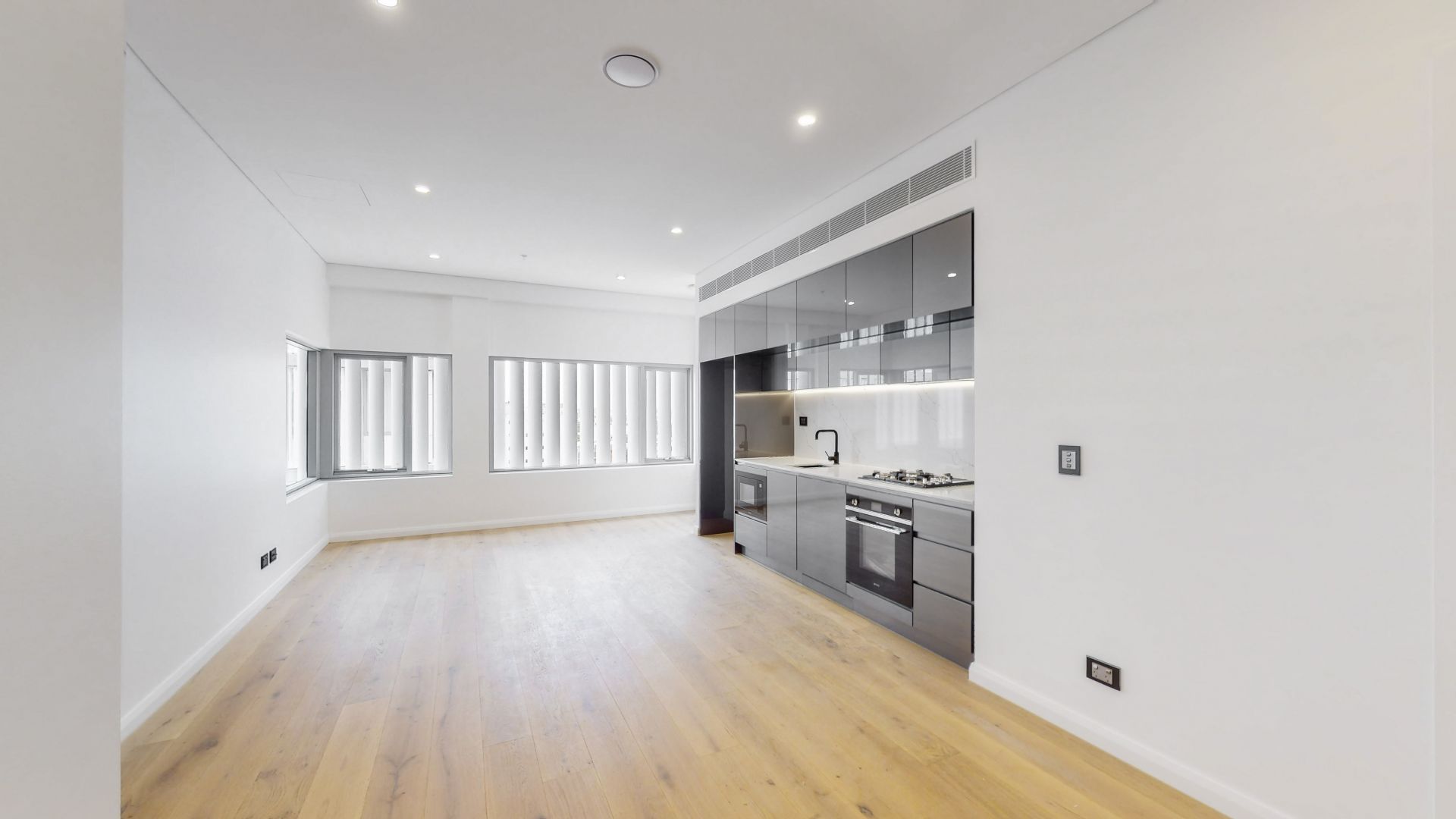 - Large open floorplan with timber flooring in living