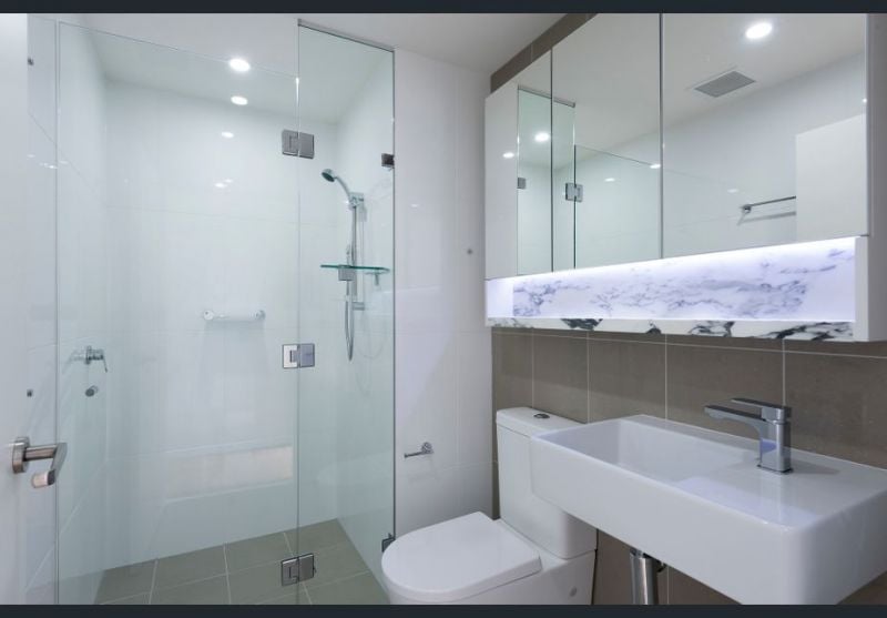 - Designer bathroom with high end marble finishes and glass shower