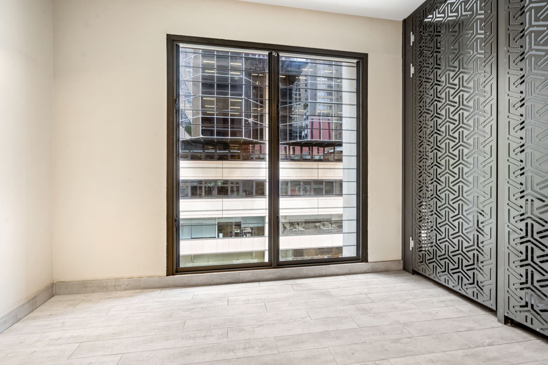 - Hardwood flooring, designer panelled walls, smoky mirrors and bronze-coloured louvres